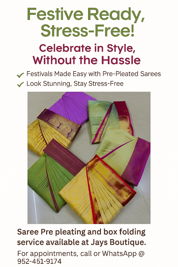 ? Get Ready for the Festival Season! ? ?? Professional Boutique Stitching, Alterations & Embroidery ? Quality Stitching for: • Blouses / Lehengas / Suits / Salwar Sets • Saree Pleating / Readymade Sarees • Aari & Maggam Work • All kinds of custom stitching available! ?? Also Available for Purchase: • Readymade Blouses • Sarees • Dresses Saree pre pleating and box folding available. Contact us today! ?? Conveniently located near Wayzata High School ?? Call or WhatsApp: 952-451-9174 ?? Facebook: Jays Boutique MN