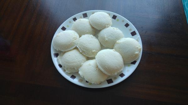 Batter, Chutney (Coconut, Peanut, Tomato) and Sambhar.